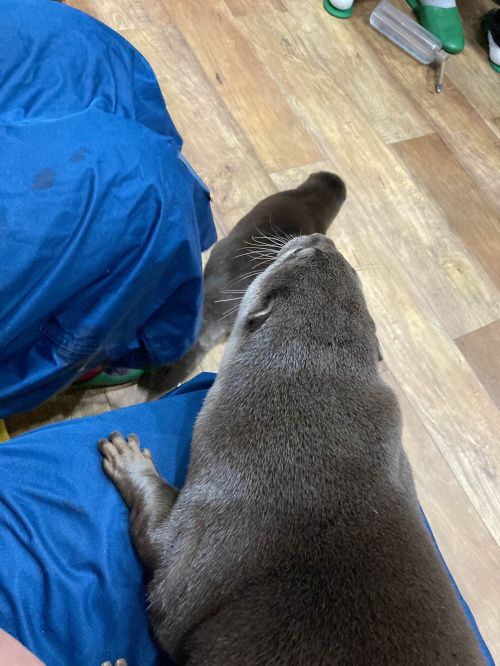 スタッフさんは餌でお客さんの膝にカワウソを誘導したり、抱っこして乗せてくれるので確実に触れるのが最高でした!!